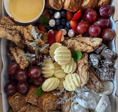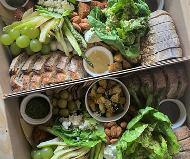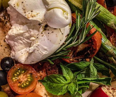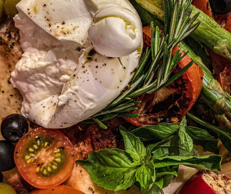 Pan árabe y Sourdough. Burrata, Ciliegine, Manchego y pimentón relleno de dip de queso y tomates secos. Pesto, Reducción de tomate con balsámico. Mix de tomates de colores, espárragos, tomates asados, Ralladura de tomate, aceite de oliva virgen extra con balsámico, albahaca, Aceitunas y uvas.