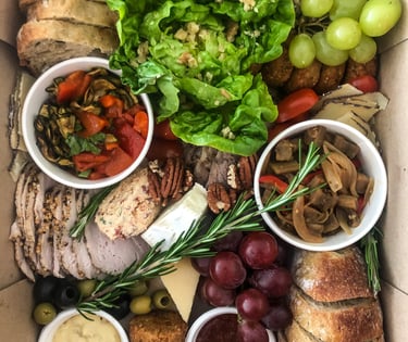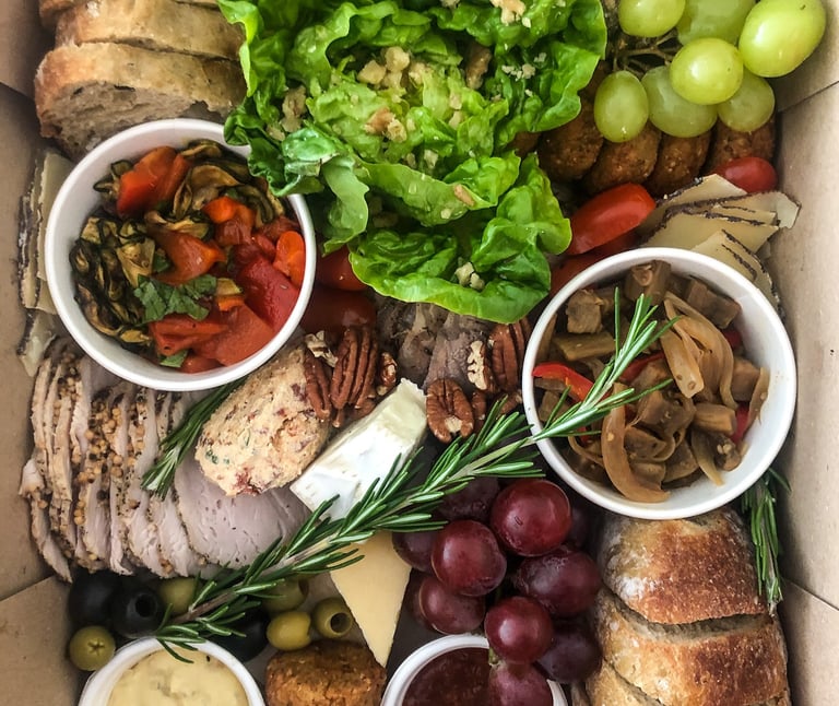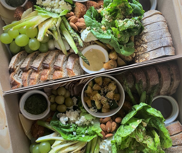 Sourdough de centeno y sourdough de avena y nueces. Lomo de cerdo, pastrami de pavo y falafel. Ciliegine, queso azul, láminas de parmesano y dip de queso con hierbas. Pesto, mermelada de naranja y salsa de mostaza con vino. Cogollo, cepa de hinojo, aceitunas verdes, espárragos, ensalada de zucchini asado, uvas verdes, peras caramelizadas y almendras.