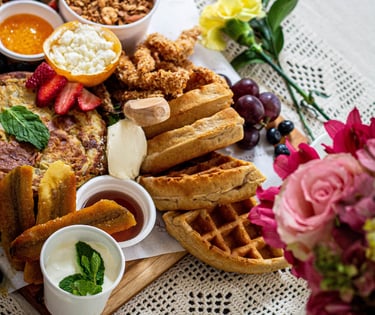 Pollo apanado, tocineta agridulce, tortilla española. Ciliegine, Queso crema y feta. Mermelada de frutos rojos, miel de maple, miel de naranja picante y nutella. Yogurt griego, granola con almendras, banano con mantequilla de canela, kiwi, fresas y arándanos.