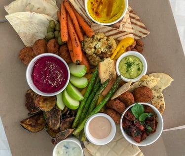 Pan árabe. Hummus de remolacha, hummus de cúrcuma y falafel. Tzatziki, melao con jengibre y cremoso de aguacate con wasabi. Chips de berenjena, croquetas de yuca, ensalada de tomate con reducción de balsámico, esparragos, pimentón, zanahoria, coliflor, manzana, aceitunas y almendras.