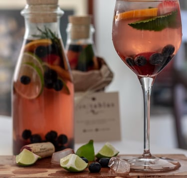 A base de vino rosado, fresas, arándanos, uvas, durazno y un toque de limón. Va acompañada con soda.