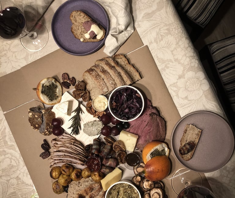 Sourdough de centeno y sourdough de avena y nueces. Dátiles con tocineta, punta de anca y pernil de cerdo. Brie, queso de cabra, gouda ahumado y dip de queso con cebolla carbonizada. Mermelada de naranja, salsa de mostaza con vino y salsa de tomate de árbol y gulupa. Ensalada de repollo, coliflor al horno, granadilla, berenjena ahumada, papa criolla, higos, aceitunas negras, uvas moradas y nueces.